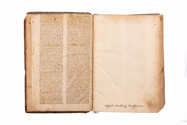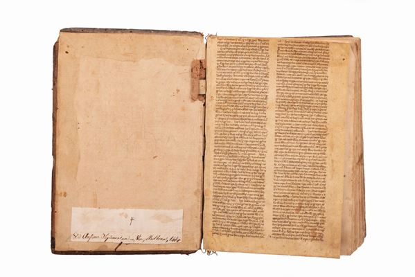 Carte [333] (di 336). Manca la prima carta di testo a2, sostituita da una carta in facsimile, e le due carte bianche in principio e in fine d'opera. Senza segnatura. Caratteri gotici (G 150) su due colonne in 47 linee. Interamente rubricato in rosso e blu. Copia scompleta di una carta di testo, con un foro di tarlo che attraversa tutto il volume, il margine inferiore del colophon ricostruito ma ad ampi margini e ben conservata. Legatura monastica con banda di cuoio decorata a freddo al dorso e ai piatti, su assi nude senza più i fermagli; rimontata, con forellini di tarlo e con lacune reintegrate nelle bande di cuoio.