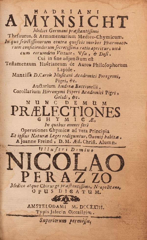 Hadriani a Mynsicht medici Germani praestantissimi Thesaurus, et armamentarium medico-chymicum. In quo selectissimorum contra quosvis morbos pharmacorum conficiendorum secretissima ratio aperitur, una cum eorundem virtute ... Nunc demum Praelectiones chymicae ... Oxonij habitae. A Joanne Freind ...