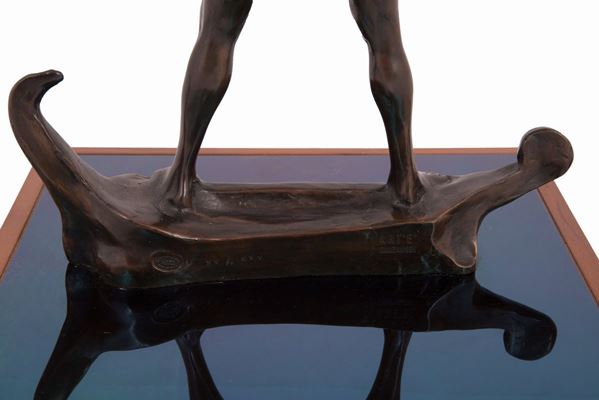 Scultura in bronzo su lastra in acciaio a specchio su base in legno