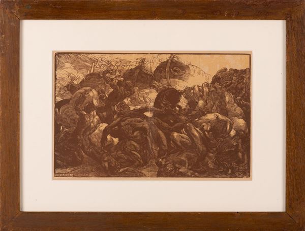 De Carolis si dedica all’arte della xilografia dal 1903, collaborando con alcune delle principali riviste del tempo e illustrando opere di Pascoli e d’Annunzio, autori che forniranno stimoli fecondi alla definizione del suo linguaggio figurativo. Foglio in ottime condizioni.