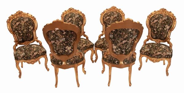 6 sedie dorate con schienale e seduta rivestiti in tessuto decorato a motivi floreali