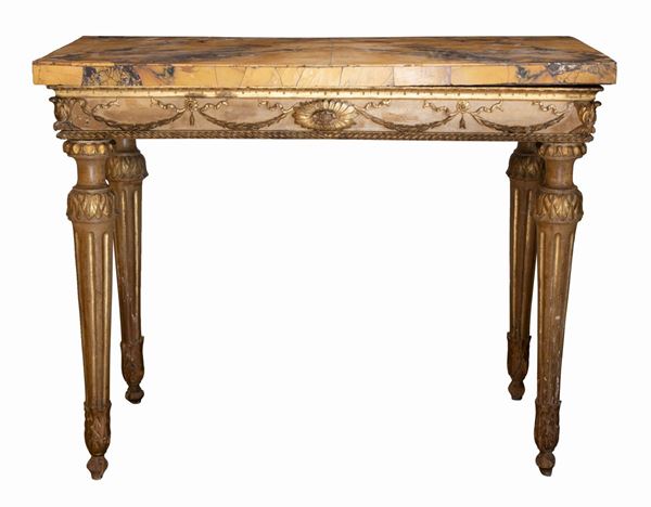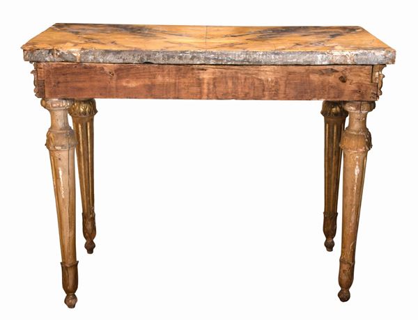 Consolle Luigi XVI dorata con piano in marmo lastronato giallo antico