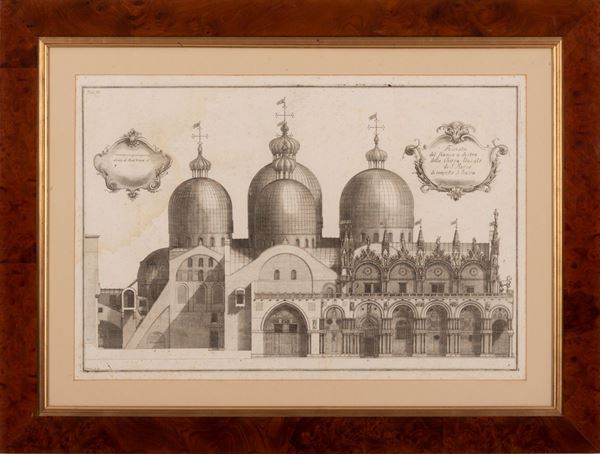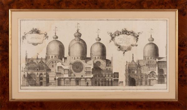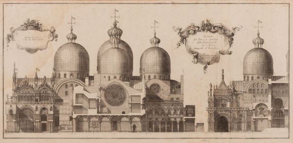 Opera "rara e magnifica ", come giustamente definita in un suo catalogo dall'editore Antonio Zatta, di certo uno dei più rappresentativi monumenti della stamperia veneziana del Settecento, grazie anche alle enormi tavole, realizzate dal celebre architetto Antonio Visentini, e incise in rame dal padre scolopio Vincenzo Mariotti. Di questo libro a stampa di raffinata fattura, dedicato alla sua chiesa più bella, San Marco, è disponibile una coppia di incisioni, per la precisione riferite allo straordinario apparato iconografico della Tav. III “Facciata del fianco a destra della Chiesa Ducale di S. Marco dirimpetto S. Bassa e della Tav. IV “Facciata del Fianco a Sinistra della Chiesa Ducale di S. Marco dirimpetto il Broglio".
