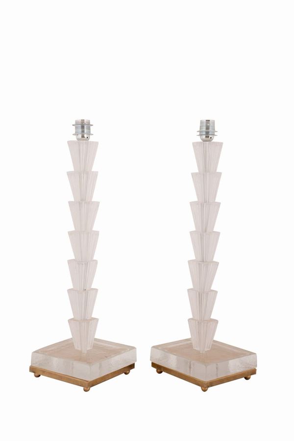 cm 70x20x20Coppia di lampade in vetro di forma piramidale con base quadrangolare in ottone sorretta da quattro piedini a sfera