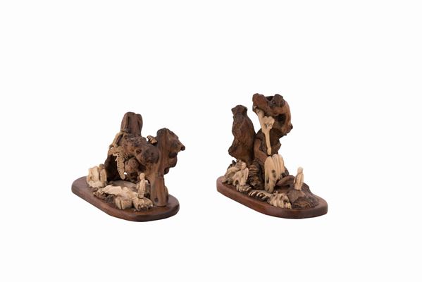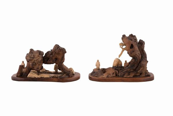 Coppia di sculture raffiguranti paesaggi orientali con figure in legno e osso