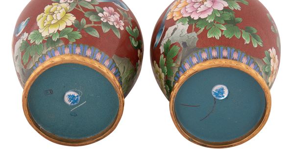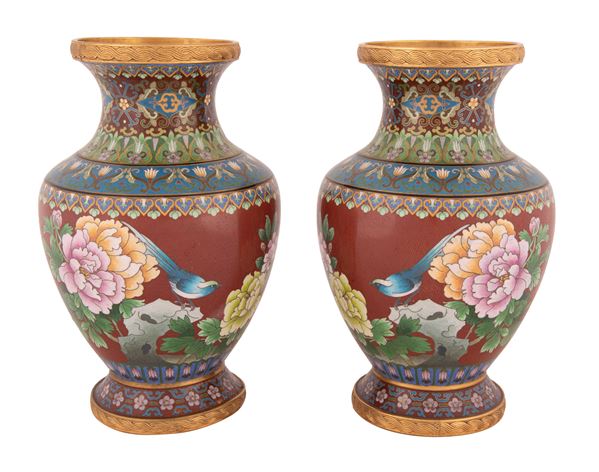 Coppia di vasi cloissonnè decorati a motivi floreali
