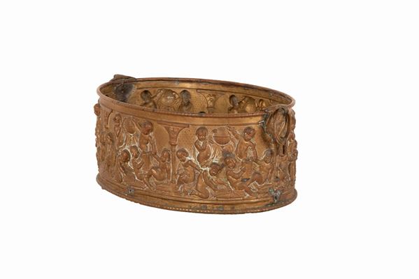 Fioriera in rame sbalzato raffigurante allegoria delle scienze e delle arti