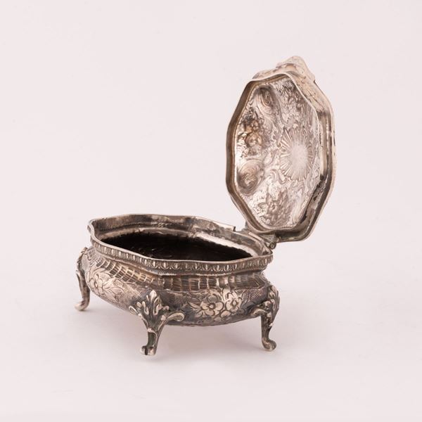 Piccola scatola ottagonale in argento con coperchio inciso a motivi floreali