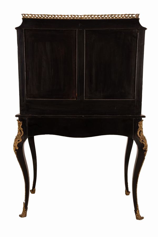 cm 137x86x53Scrittoio in legno ebanizzato con due sportelli su fronte e piccoli cassetti. Un cassetto grande centrale.