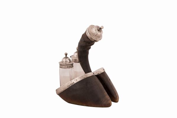 cm 17x9x11Alla base due salierine in vetro e argento. Pepiera in corno di bufalo. Coperchio in argento.