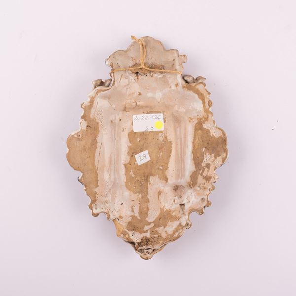 Acquasantiera in maiolica con decorazioni e figure in rilievo, recante al centro l'effigie dell'Immacolata.