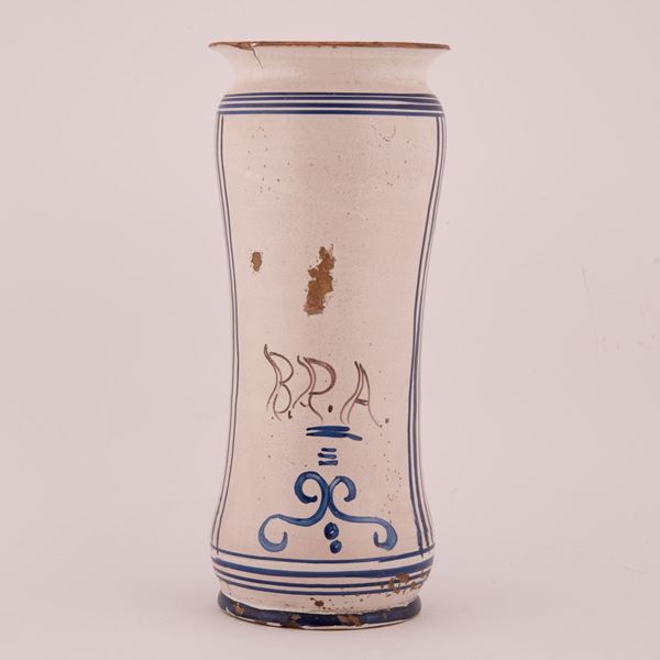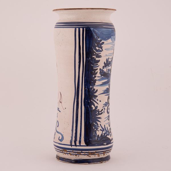 Albarello in maiolica decorato in monocromia blu con un paesaggio agreste ed uno stemma gentilizio. Iscrizioni: B. P. A., sul retro dell'ogge [..]