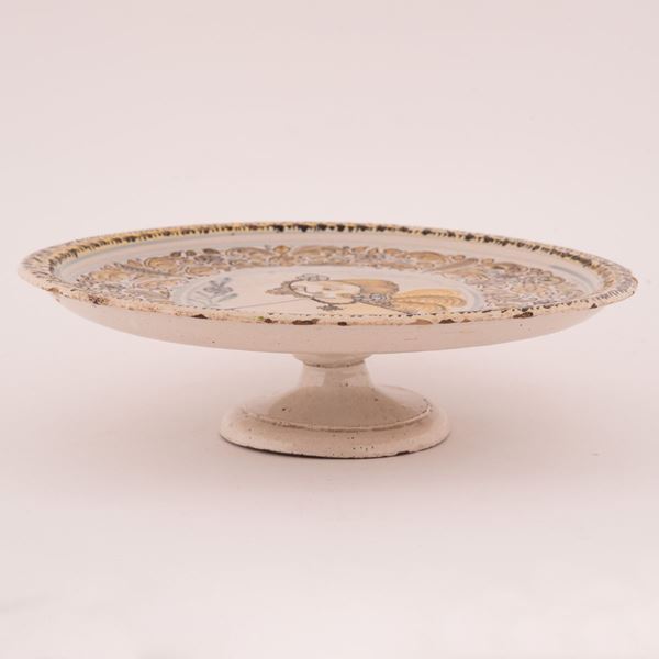 Alzata in maiolica decorata con una fascia di motivi ornamentali a "penna di struzzo" con al centro, il ritratto di una "bella"