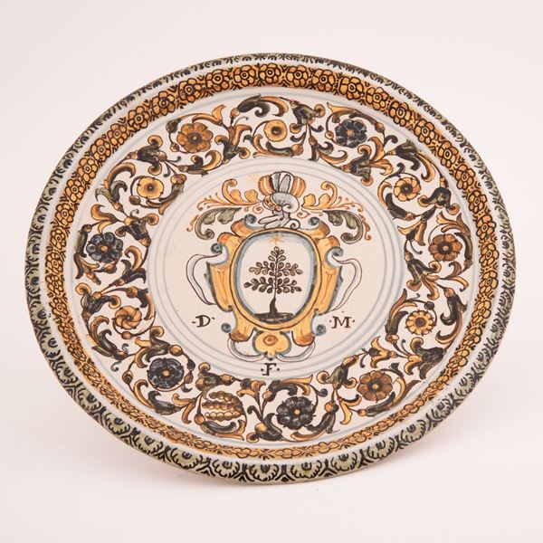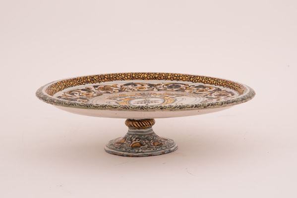 Alzata in maiolica decorata in policromia con stemma araldico della famiglia Delfico con ai lati le iniziali "M.F.D." nel cavetto. Decoro floreale [..]