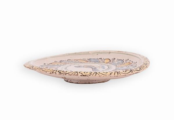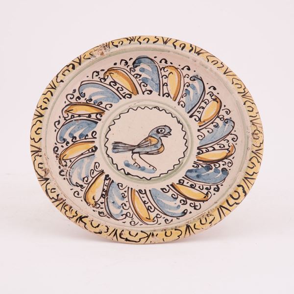 Alzata in maiolica decorata in policromia nello stile compendiario con al centro un uccello.