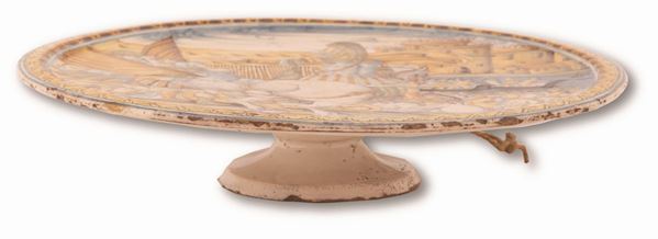 Alzata in maiolica istoriata con una scena bellica. La presa di Gerusalemme. Il soggetto in primo piano rimanda a una incisione del Tempesta. [..]