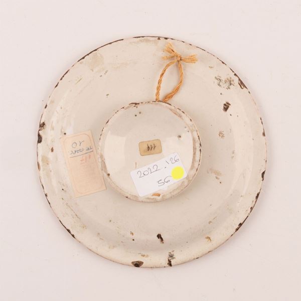 Alzatina in maiolica decorata con animale stante in uno scorcio di paesaggio
