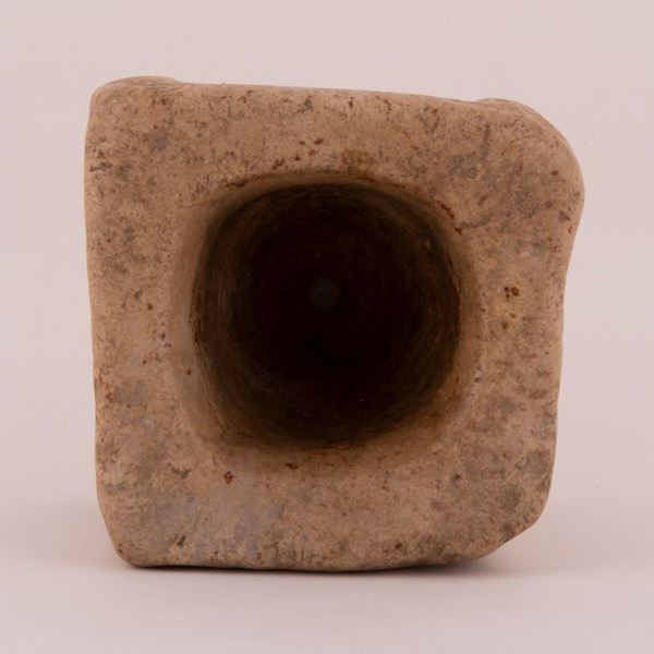 cm 14x21Mortaio in pietra calcarea di forma troncoconica arrotondata all'esterno con quattro prese apicate in parte abrase ai bordi. Orlo di grande spessore.