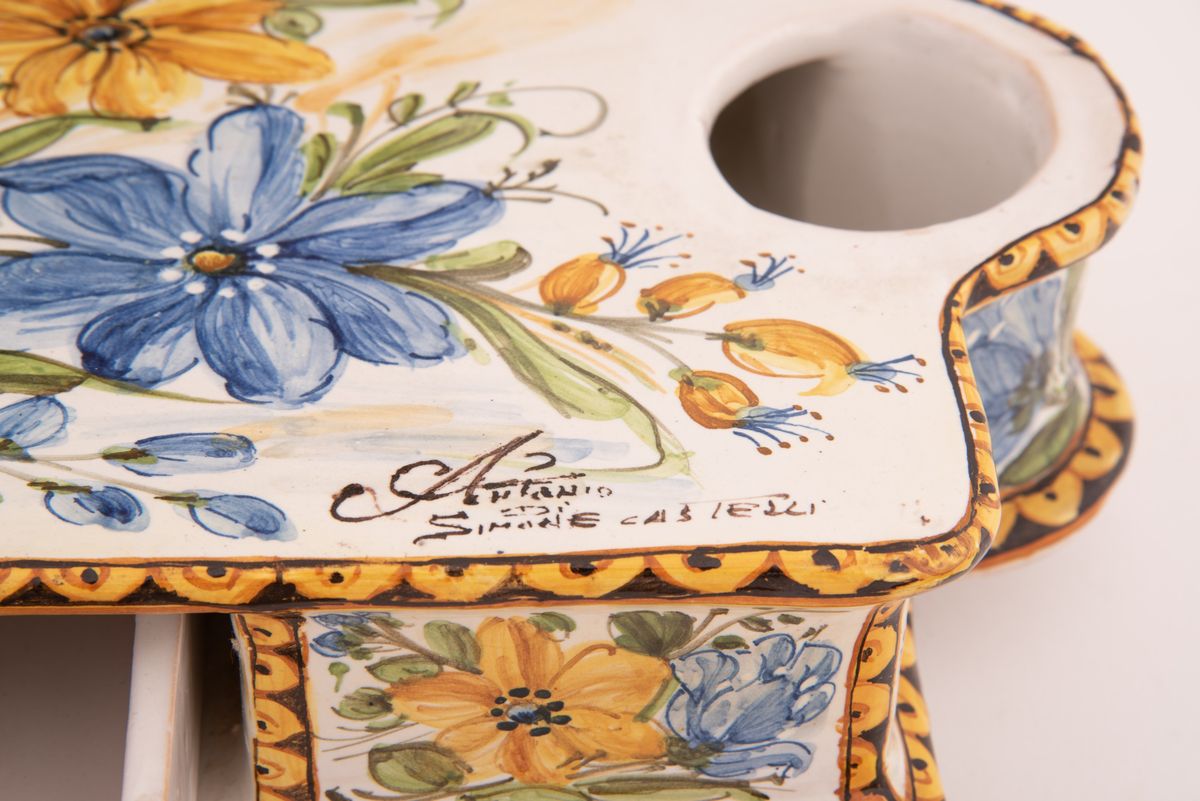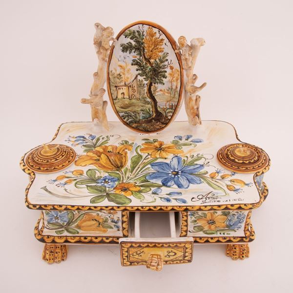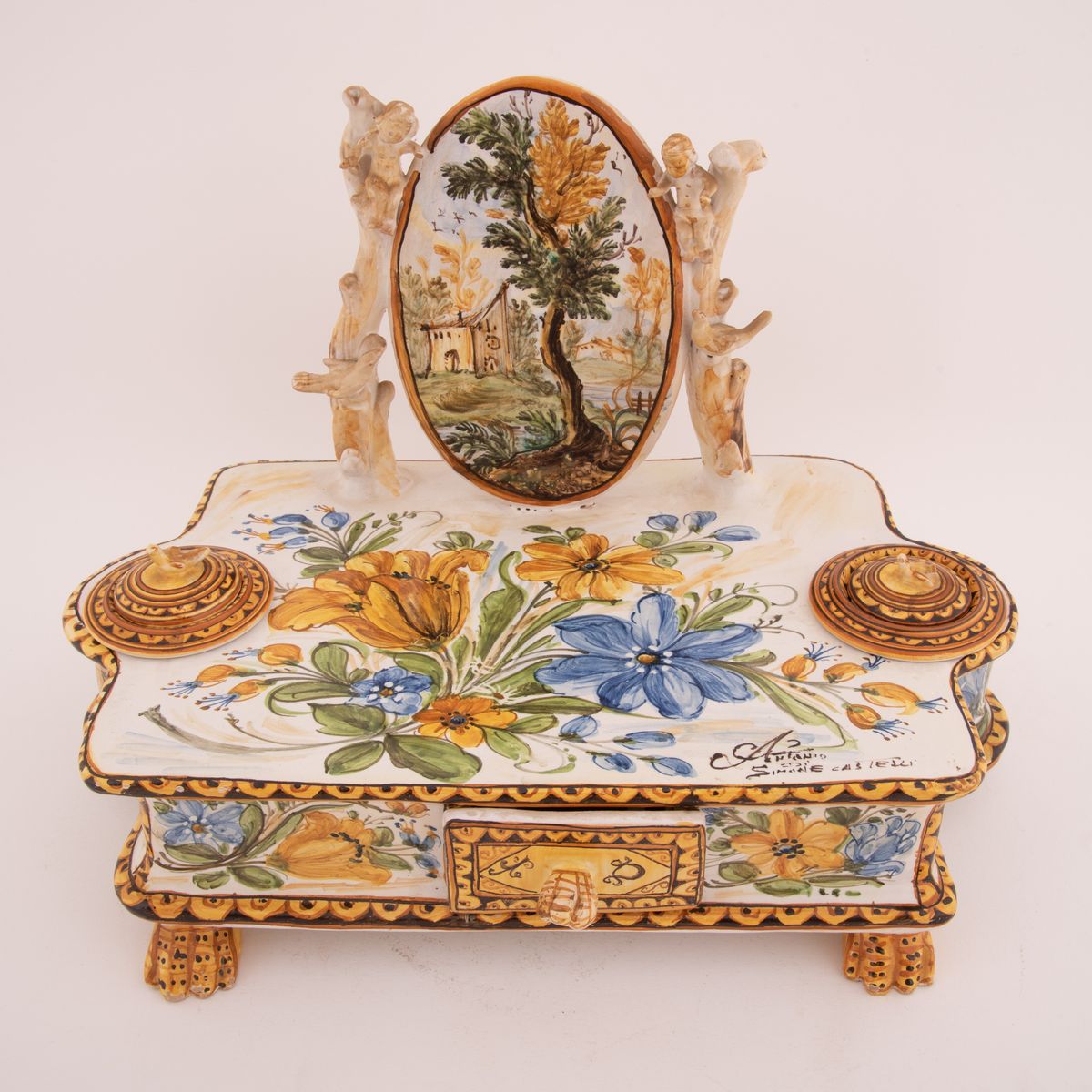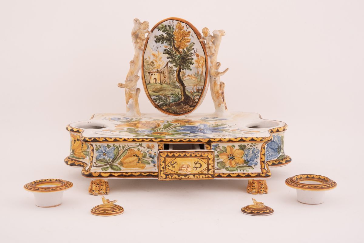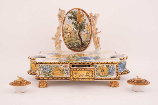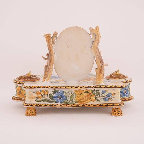Calamaio in maiolica a fondo bianco decorato in policromia. Al centro medaglione ovale con paesaggio sorretto da putti.
