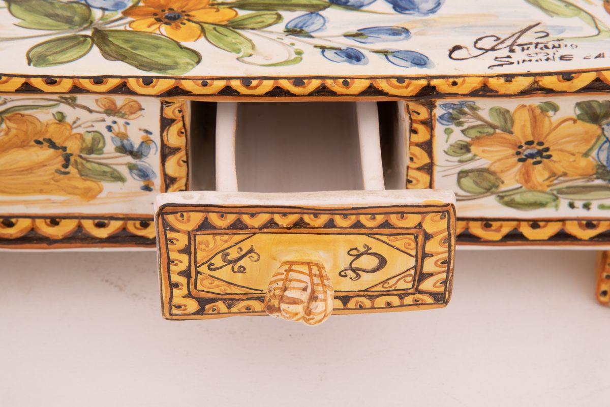 Ai lati ricco decoro a motivi floreali. Bordo a palmette nei toni del giallo. Piedi ferini.