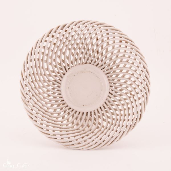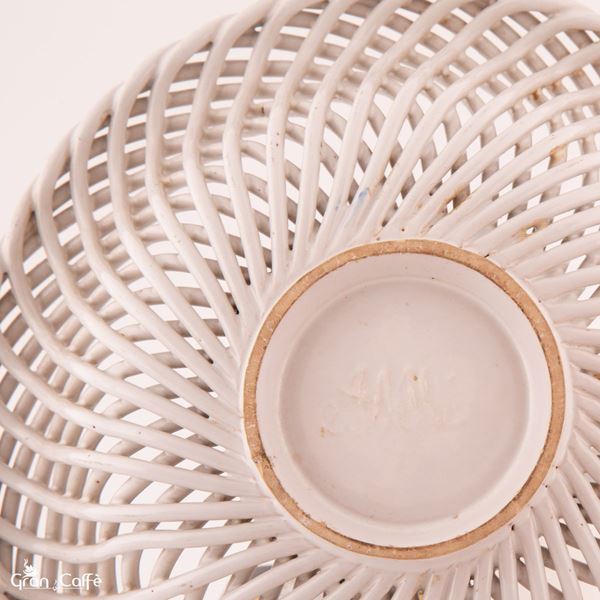Centrotavola in maiolica modellato ad intreccio imitante il vimini. Monogramma: A M C, impresso sotto la base.