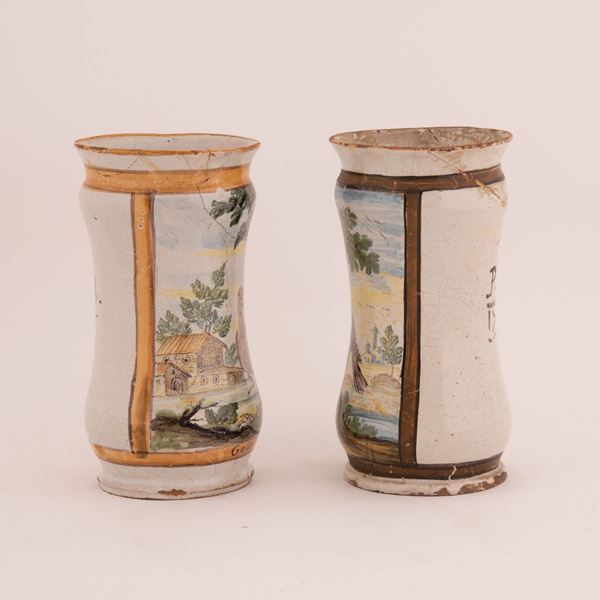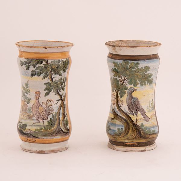 Coppia di albarelli in maiolica decorati in policromia. Al centro rappresentati rispettivamente un gallo e un passero in paesaggio.