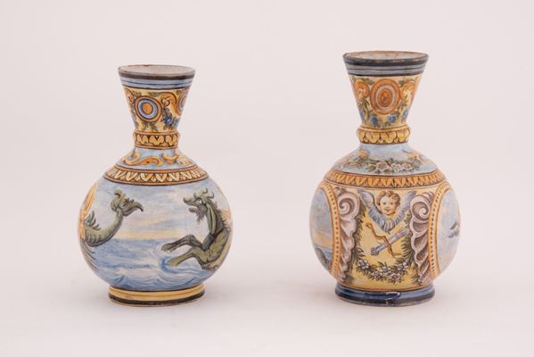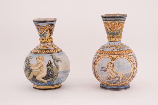 Coppia di bottiglie in maiolica decorate in policromia con festoni ed elementi rocaille. Sul corpo scene con putti, cupido, Venere e tritoni [..]