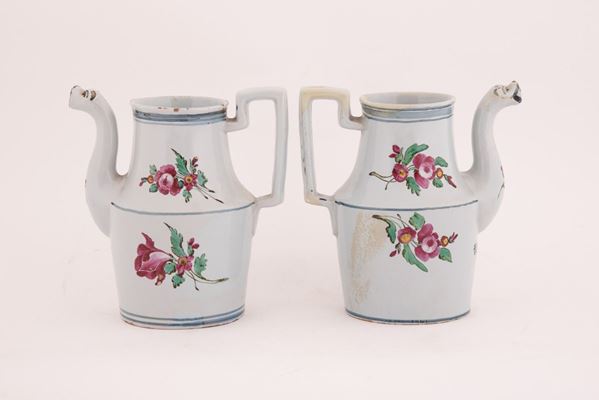 Coppia di caffettiere Castelli in maiolica con decorazione policroma a terzo fuoco con ramoscelli di rose sparse.