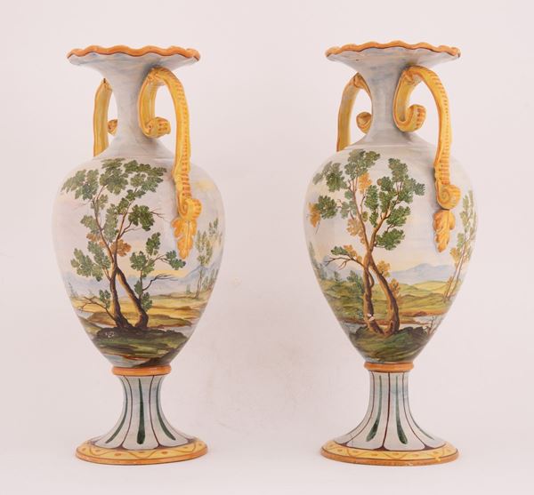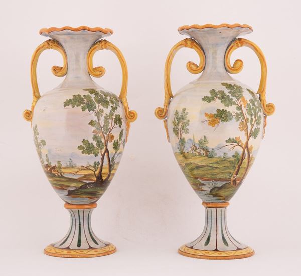 Coppia di vasi biansati in maiolica con corpo ad anfora su alto piede, decorai in policromia con paesaggi alberati e case. Bordo superiore on [..]