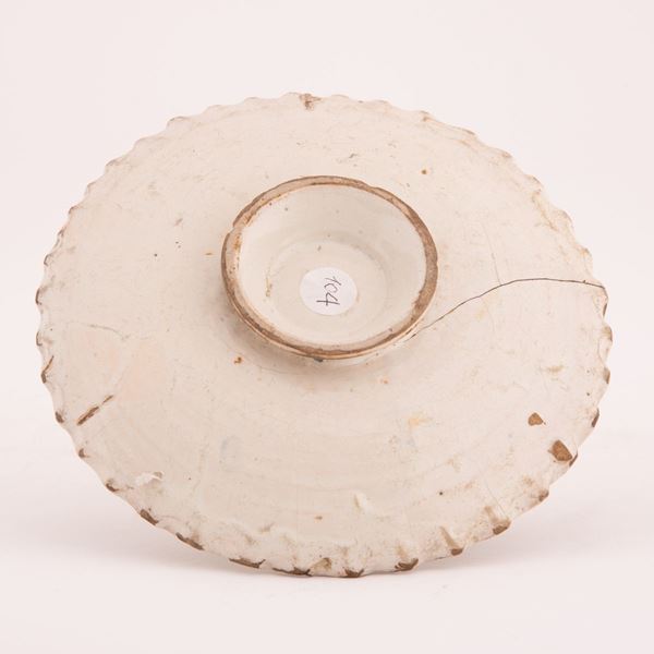 Ø cm 22,5; altezza cm 3Al centro motivo vegetale circolare, incorniciato da ghirlanda a motivi vegetali e floreali stilizzati. Bordo ondulato.