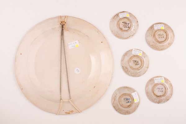 Grande piatto da portata e 5 piattini in maiolica a fondo bianco decorati in policromia. Al centro del cavetto figura di uccello.