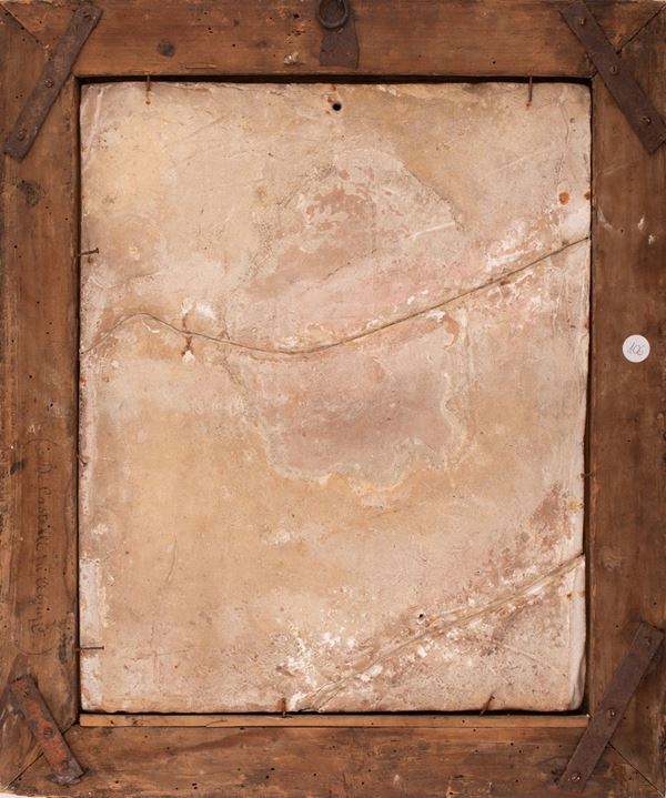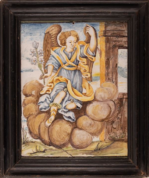 Grande placca in maiolica decorata in policromia con angelo annunciante poggiato su una nuvola in paesaggio con rovine.