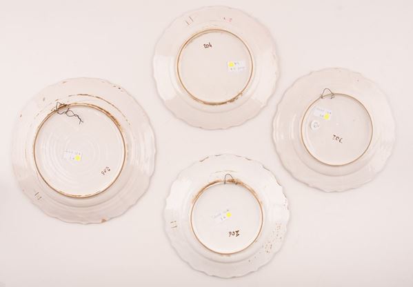 Lotto di centrotavola e 3 piatti in maiolica a bordo mistilineo, decorati in policromia con motivi vegetali e fiori