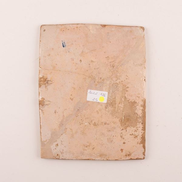 Mattonella devozionale in maiolica raffigurante l'apparizione della Madonna con il Bambino ad una figura femminile stante in posizione orante [..]