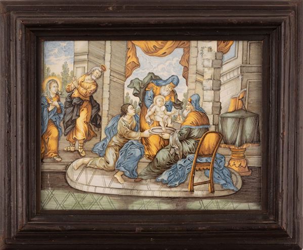 Mattonella maiolicata, istoriata con la scena Evangelica della Circoncisione di Cristo.