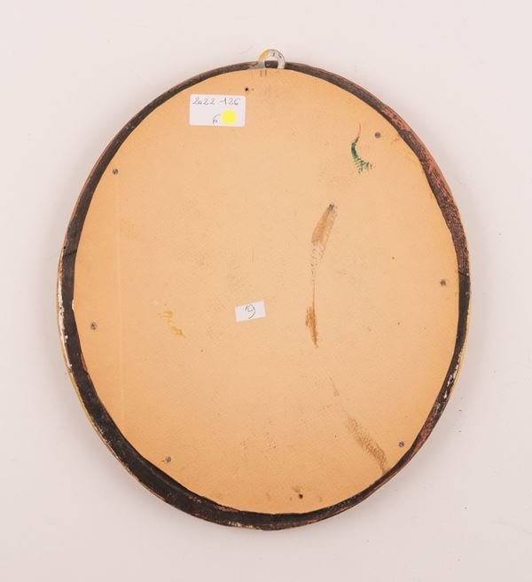 Mattonella maiolicata ovale decorata con l'effigie di Sant'Antonio Abate.
