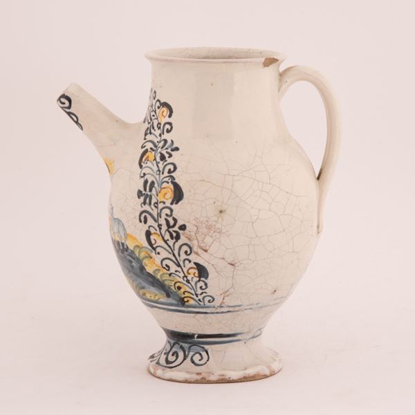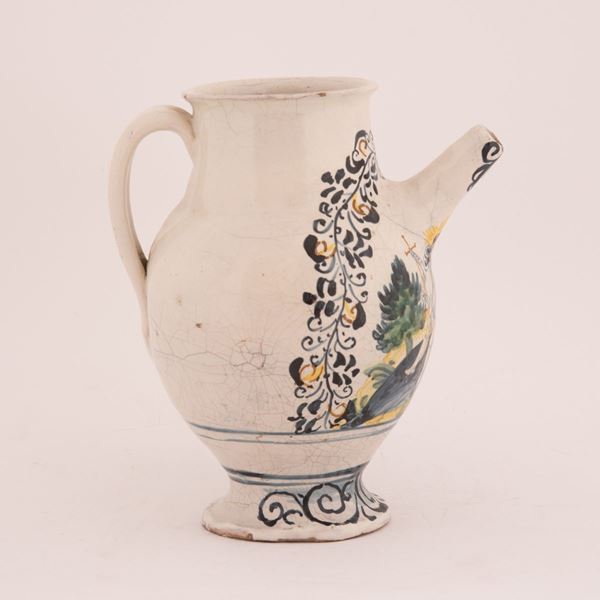 Orciolo in maiolica decorato in policromia raffigurante San Giovannino seduto su una roccia con l'Agnello divino incorniciato da decorato fogliaceo. [..]