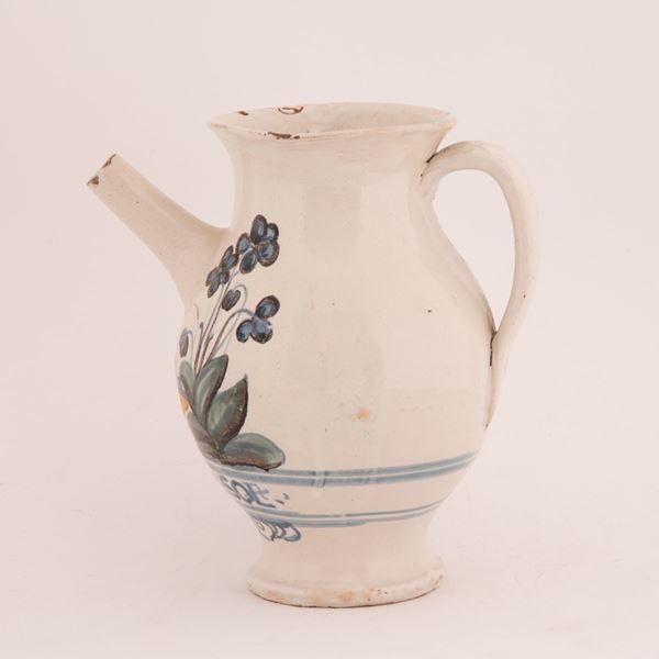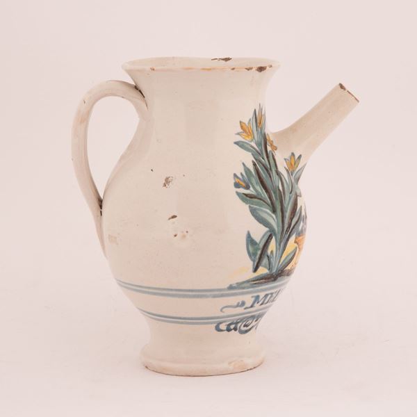 Orciolo in maiolica policroma con decoro di giardino, cesto di viole. Probabilmente bottega di Gesualdo Fuina