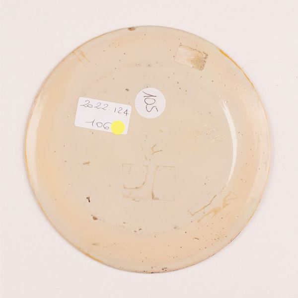 Piattino in maiolica decorato in policromia con paesaggio alberato e putto in primo piano.