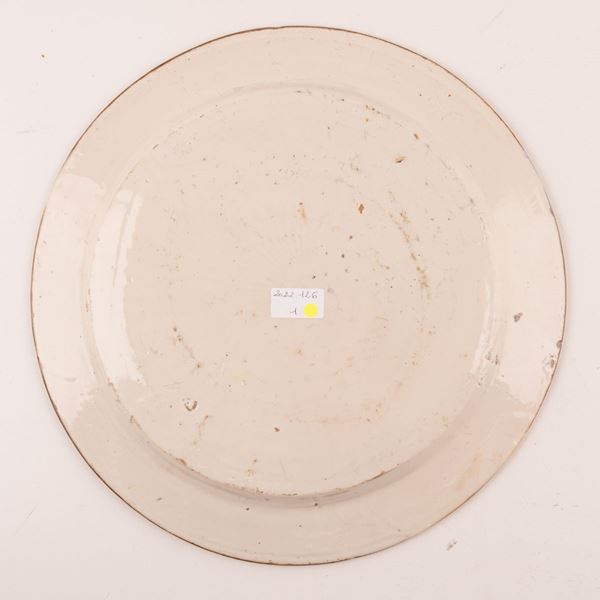 Piatto da "parata" decorato con minuti racemi fioriti sulla tesa e con scena venatoria nel cavo, tratta da antica incisione del Tempesta