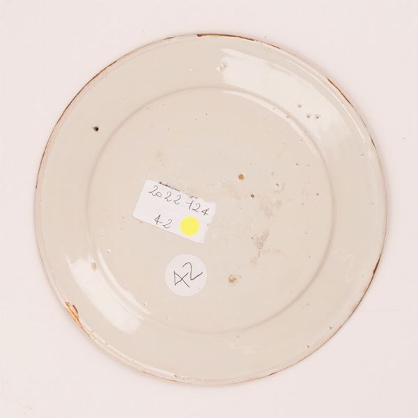 Piatto in maiolica con rappresentata al cavetto una scena mitologica con Anfitrite sul dorso di un cavallo marino.