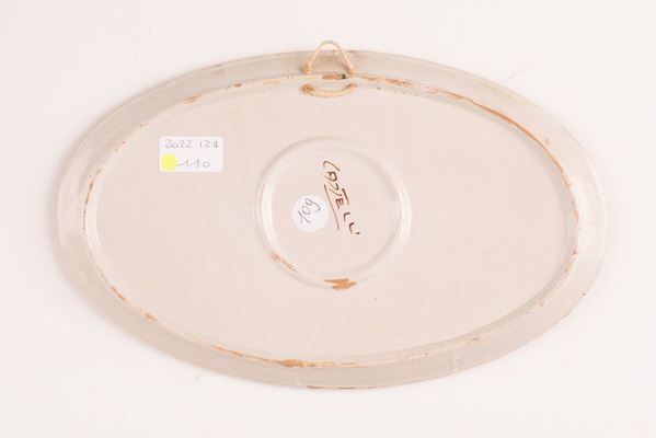 Piatto ovale decorato in policromia con paesaggio, lago e case. Bordo festonato in giallo.