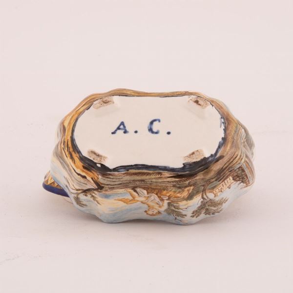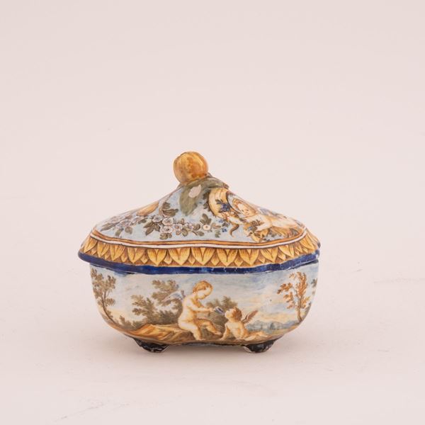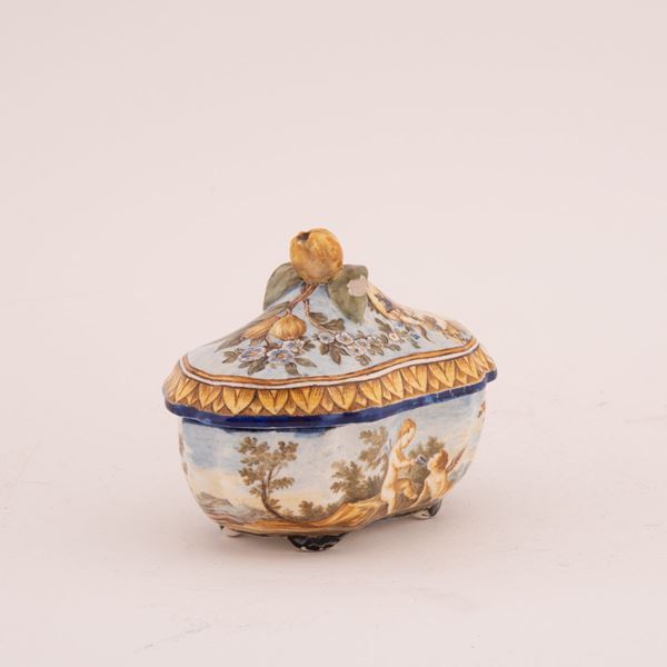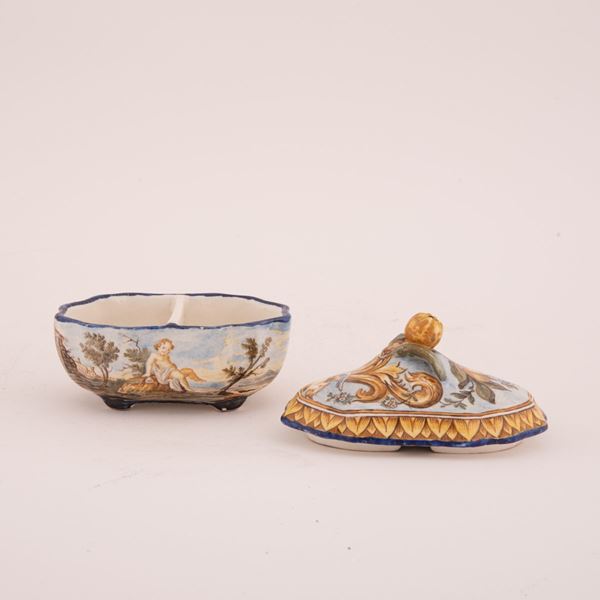 Saliera decorata sul corpo in policromia con putti e paesaggi. Coperchio decorato con putto, foglie d'acanto e fiori con presa a forma di fru [..]