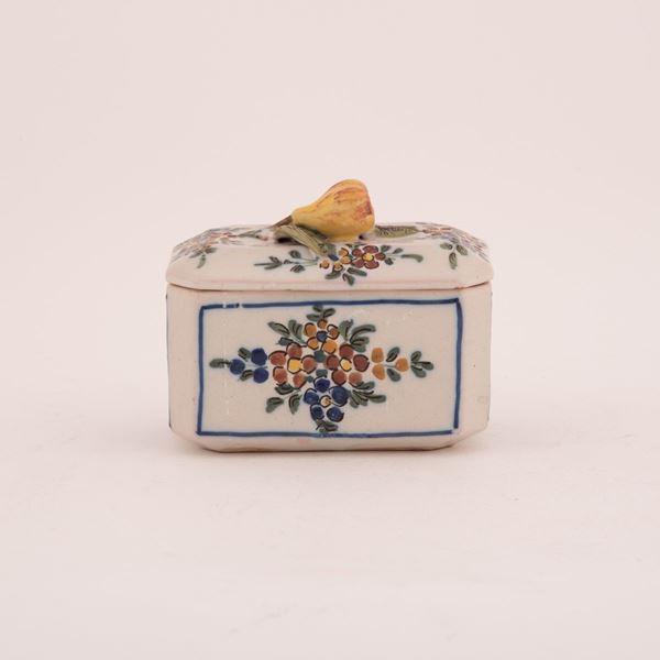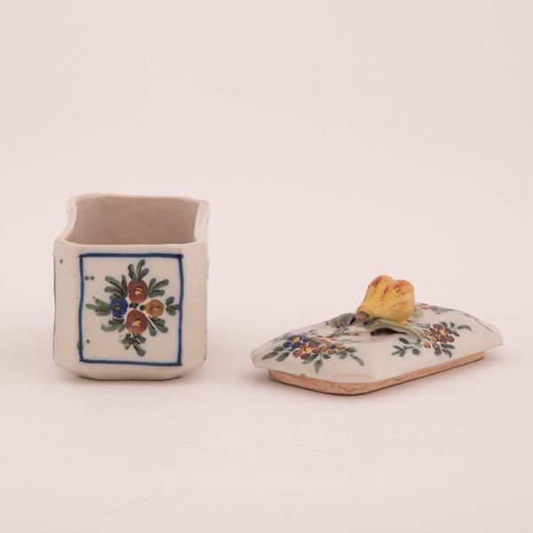 Scatola in maiolica con coperchio decorata a motivi vegetali. Presa a pera.