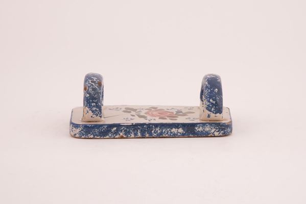 Schiacciapatate in maiolica policroma. Al centro su fondo bianco decorato con una rosa. Sul doppio manico e sul perimetro motivo in blu realizzato [..]