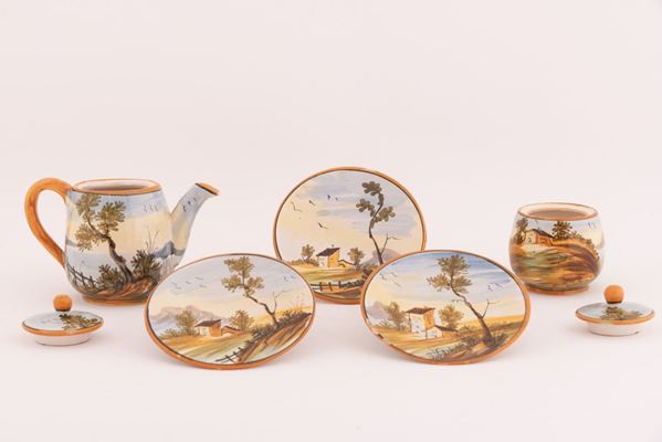 Servizio da caffè in maiolica decorato in policromia con paesaggi e case.