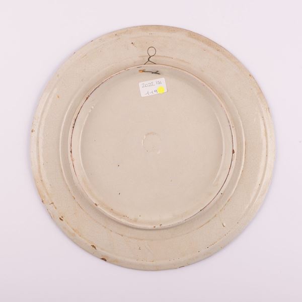 Tagliere in maiolica decorato con la figura di un gatto racchiusa in una riserva circolare, composto da elementi floreali e volute