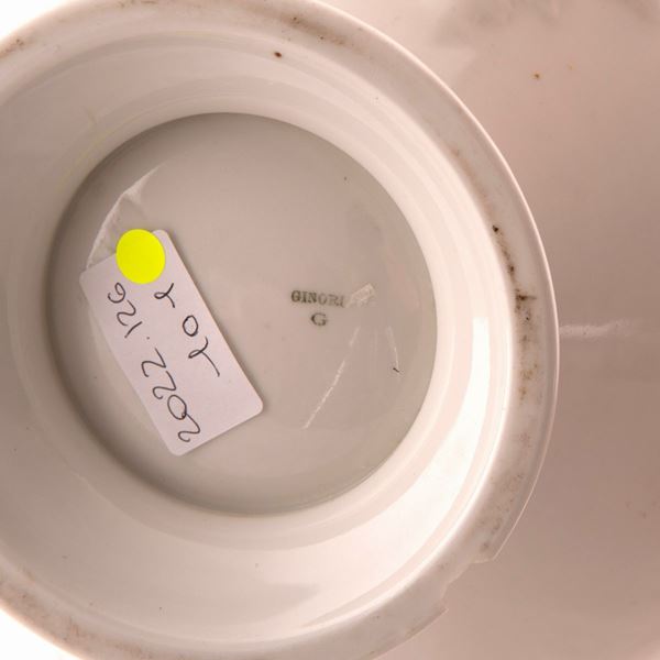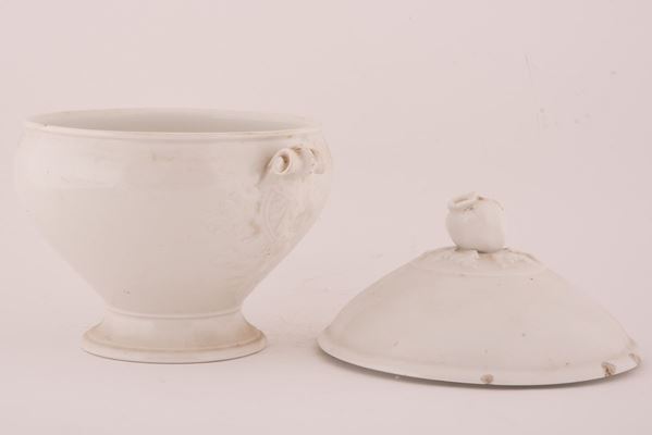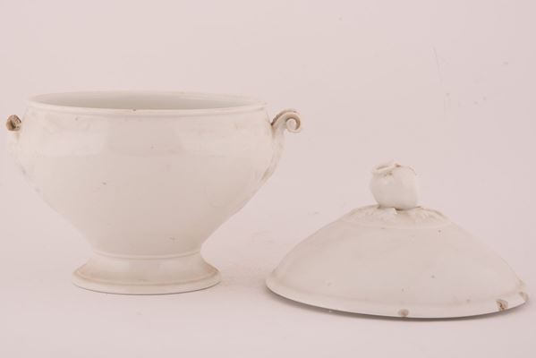 Zuppiera in maiolica decorata con elementi naturalistici (fiore e frutto) a rilievo.