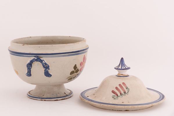 Zuppiera in maiolica decorata in policromia con decorazione floreale e bordature in blu