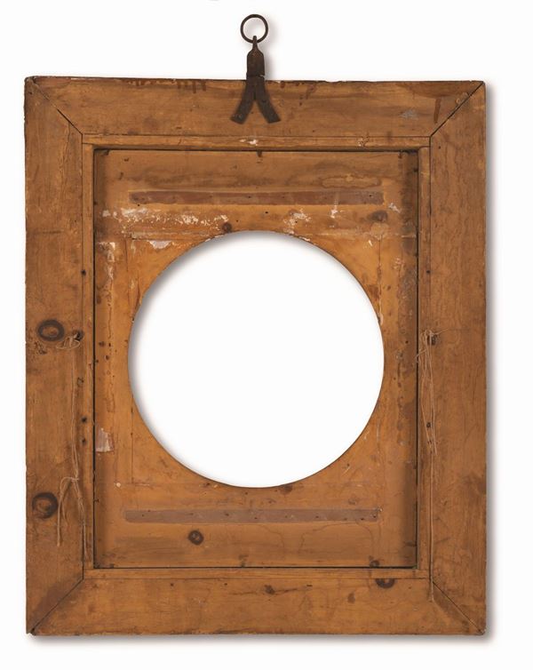 Cornice in legno e pastiglia dorata, decorata con volute e conchiglie.